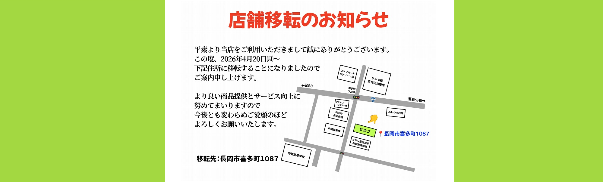 - 2026年5月から長岡市喜多町の新店舗に移転予定です。