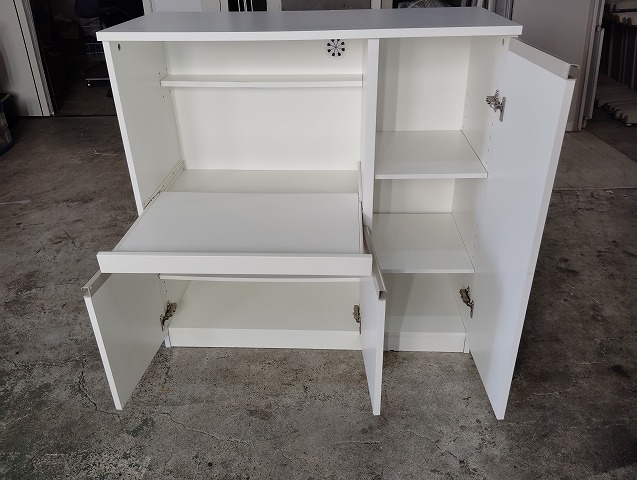 幅900 高さ895 奥行395 棚板にふやけがあります。その他目立つ傷や汚れはありません。 ※大型商品につき配達は自社便配達のみ承ります。又、荷受け時にお手伝いが必要です。 ※この商品は新潟県外発送致しません。