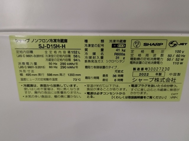 シャープ SJ-D15H-H 2ドア冷蔵庫 黒色 152L『中古美品』2022年