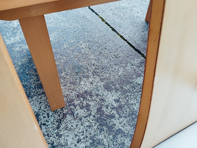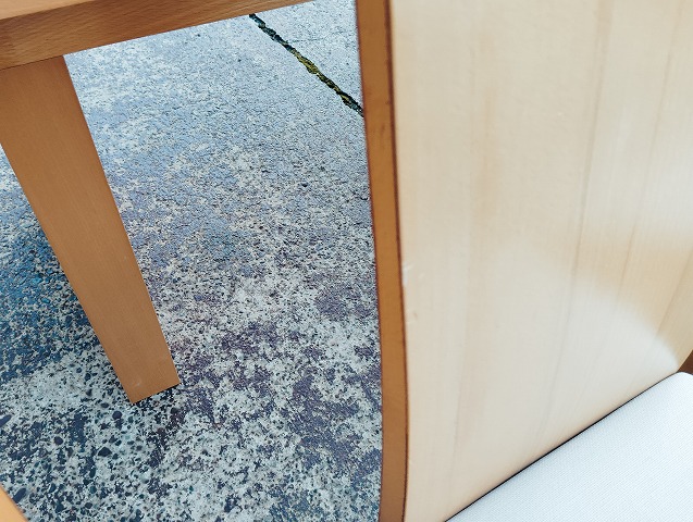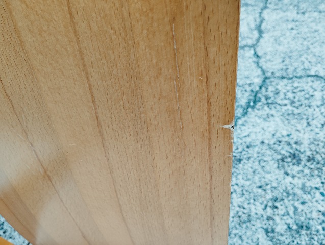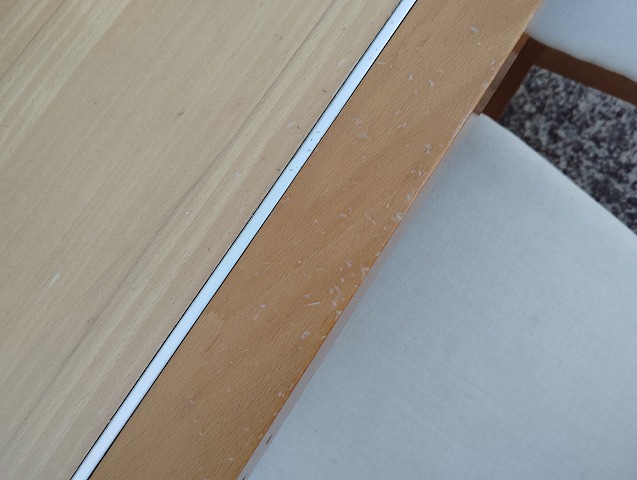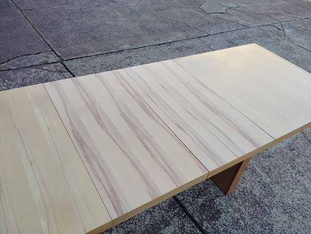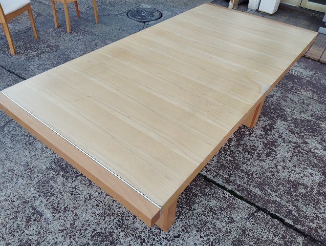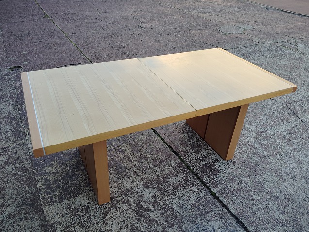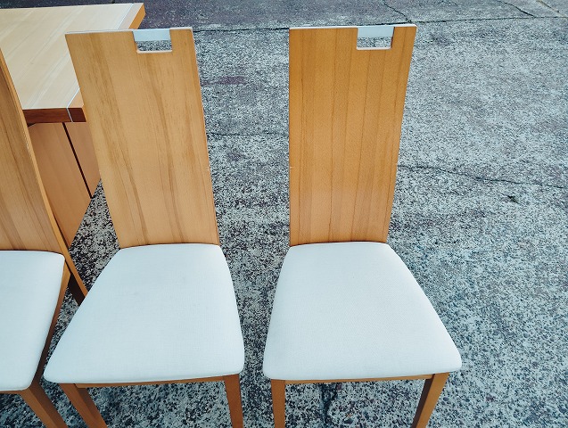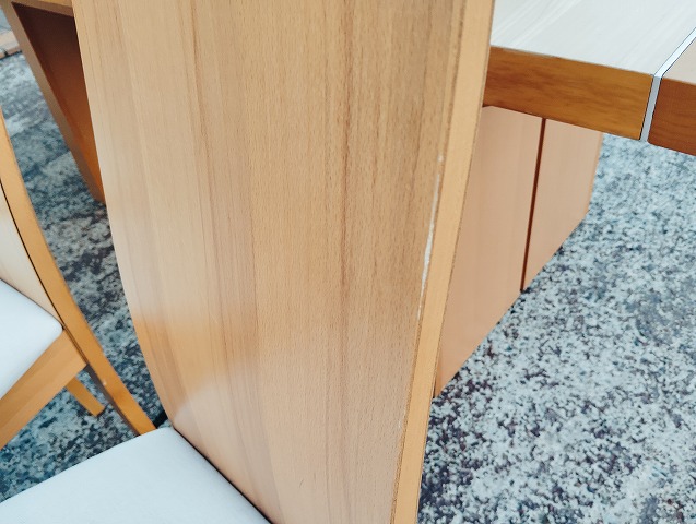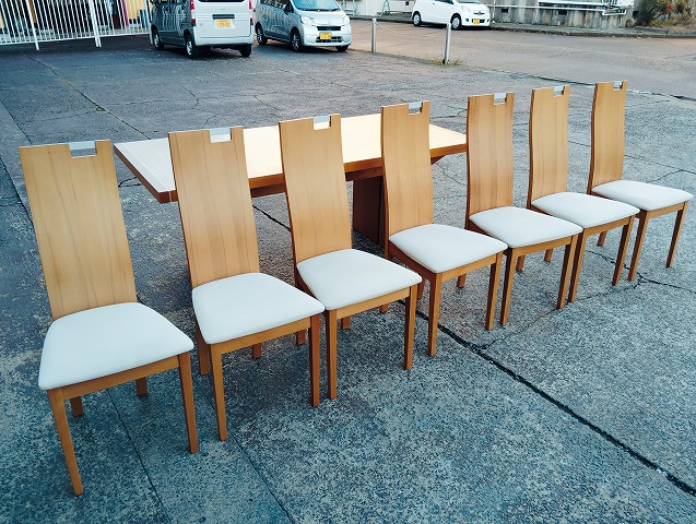 伸張式ダイニングテーブルと椅子7点のダイニングセットです。天板中央部に一部変色箇所があります。イス背もたれに小傷と座面に極薄い染みがあるものがあります。その他目立つ傷や汚れの無い良品です。