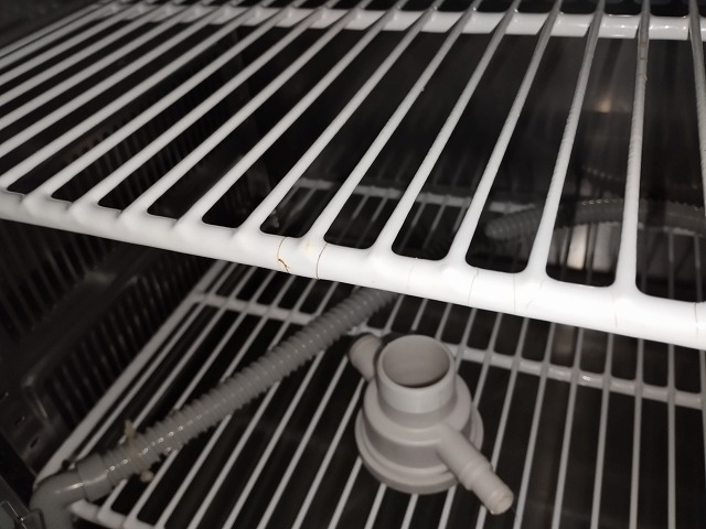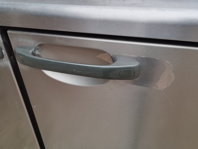 2扉の冷蔵庫です。ドアノブ付近の保護シールの剥がれ、棚板にひび割れ箇所があります。新品時約225,000円の品です。