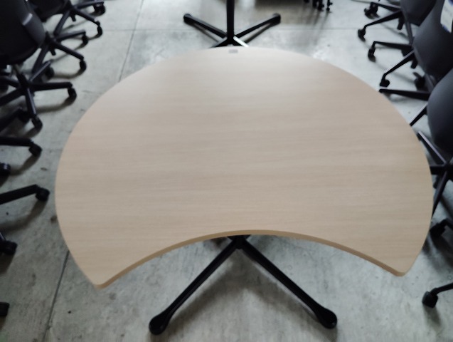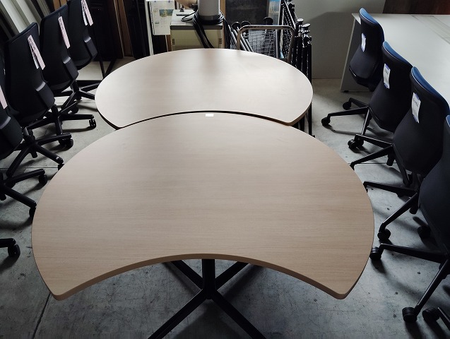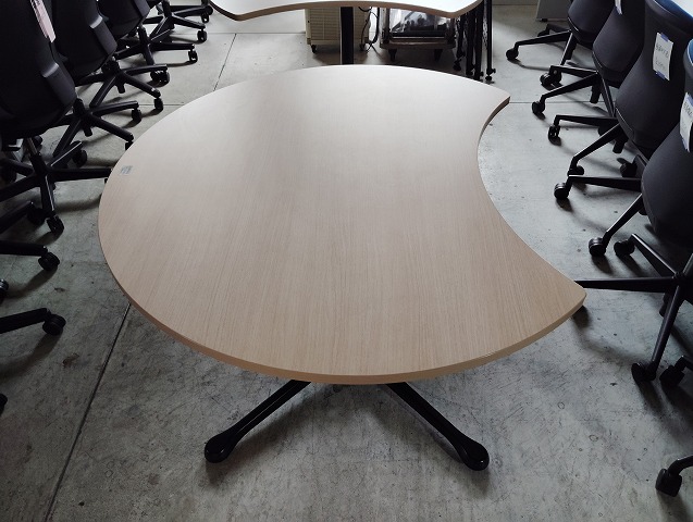 同程度で2台入荷しました!三日月型の会議テーブルです。キャスター付きで移動も適しています。2台を写真の様にくっ付ける事も可能です。目立つ傷や汚れの無い美品です!新品時122000円の品!