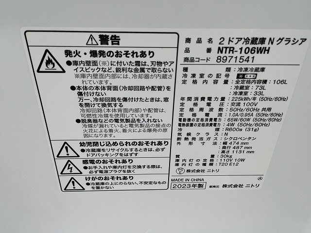 ニトリ NTR-106 2ドア冷蔵庫 白色 106L『中古良品』2023年 複数入荷!