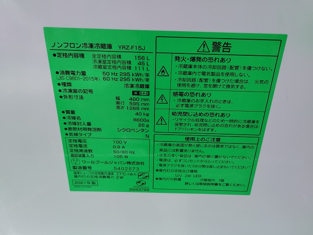 ヤマダ YRZ-F15J 156L 2ドア冷蔵庫(中古良品)2021年式