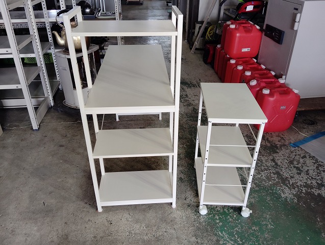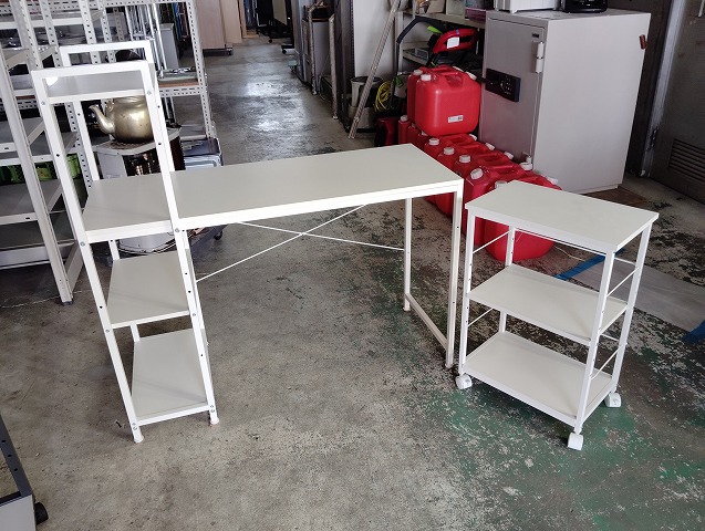 幅1100 高さ715~1150 奥行520 ラック付き平机です。キャスター付きワゴンが付きます。ワゴンの天面に薄い染み汚れがありますが、その他目立つ傷や汚れの無い良品です! ※大型商品につき配達は自社便配達のみ承ります。又、荷受け時にお手伝いが必要です。 ※この商品は新潟県外発送致しません。