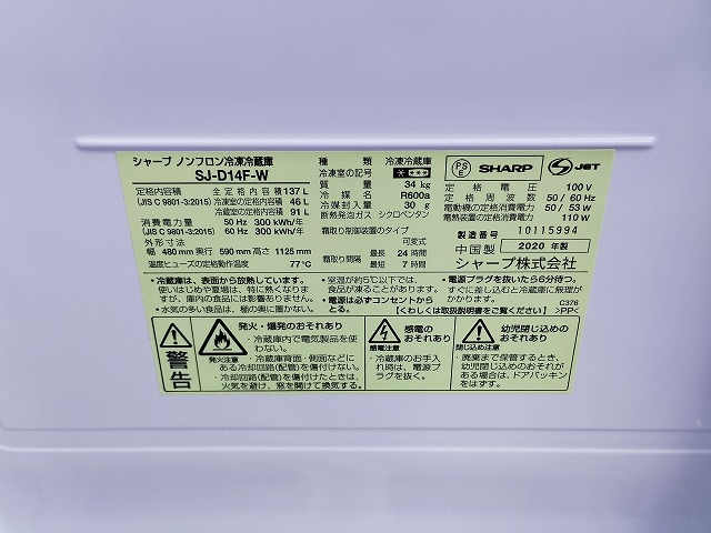 シャープ SJ-D14F-W 2ドア冷蔵庫 木目白色 137L『中古良品』2020年