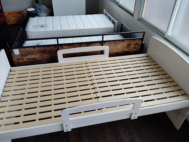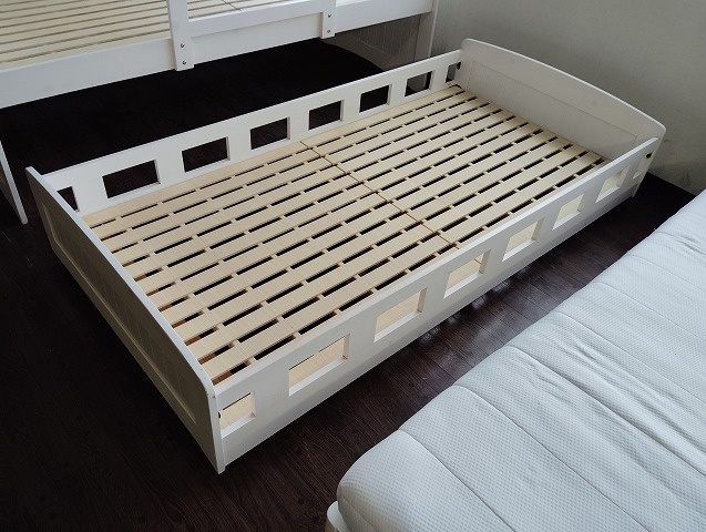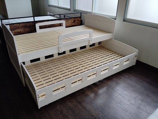 上段:幅1050 床高さ550 奥行2110 下段:幅1020 床高さ150 奥行1995 木製ベッドフレーム2台のセットです。それぞれ独立したベッドとしても利用可能です。下段はキャスターが付いています。小傷が多々あります。 ※大型商品につき配達は自社便配達のみ承ります。又、荷受け時にお手伝いが必要です。 ※新潟県外に配達ご希望の場合、必ず事前にお問い合わせ下さい。
