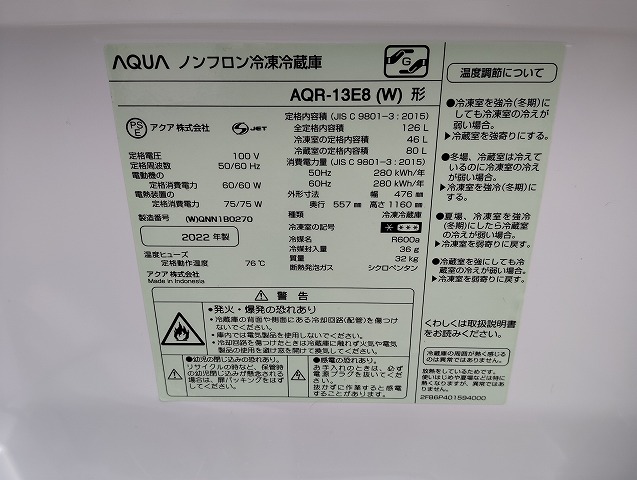 幅476 高さ1160 奥行557 2022年式、白の126Lの冷蔵庫です。特に目立つ傷や汚れの無い美品です! (ファン式霜取り不要) ※大型商品につき配達は自社便配達のみ承ります。又、荷受け時にお手伝いが必要です。 ※この商品は新潟県外発送致しません。