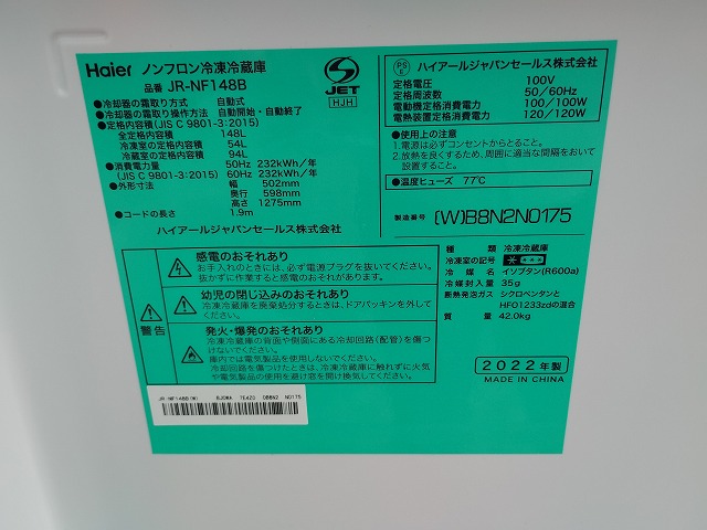 幅502 高さ1275 奥行598 2022年式、148Lの冷蔵庫です。特に目立つ傷や汚れの無い美品です! (ファン式霜取り不要) ※大型商品につき配達は自社便配達のみ承ります。又、荷受け時にお手伝いが必要です。 ※この商品は新潟県外発送致しません。