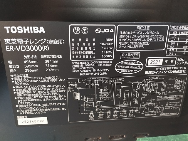東芝 ER-VD3000 石窯ドーム オーブンレンジ『中古良品※オーブン用角皿無し』2020年