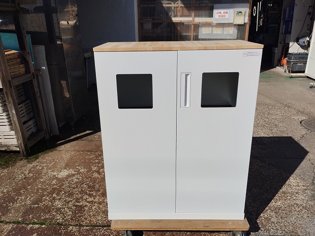 幅900 高さ1120 奥行450 書庫風のダストボックスです。パイン材の天板が付いています。目立つ傷や汚れの無い美品です!新品時約113000円の品です! ※大型商品につき配達は自社便配達のみ承ります。又、荷受け時にお手伝いが必要です。 ※この商品は新潟県外発送致しません。