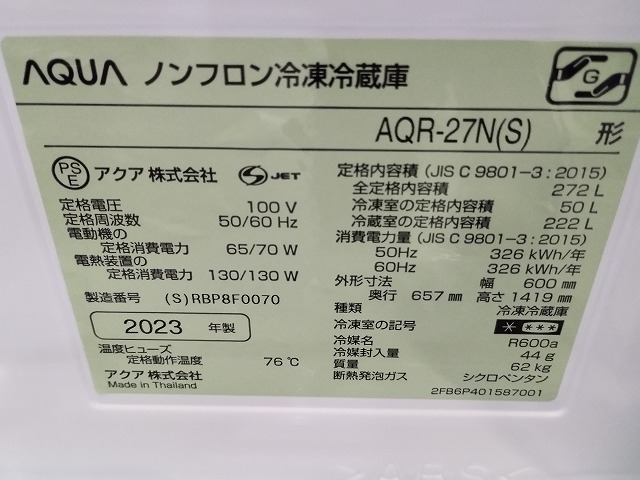 アクア AQR-27N(S) 3ドア冷蔵庫 シルバー色 272L『中古美品』2023年