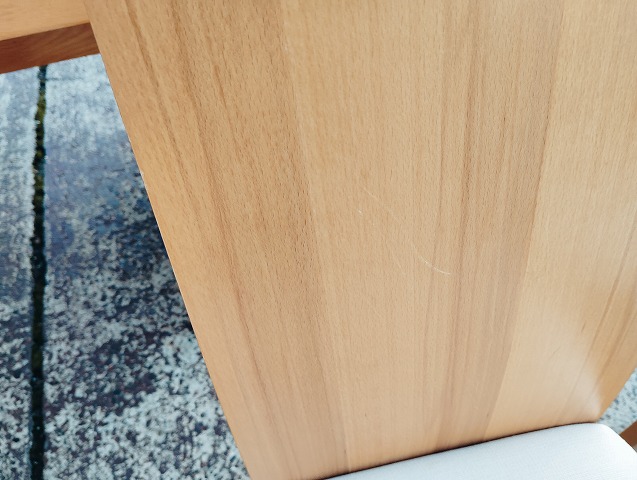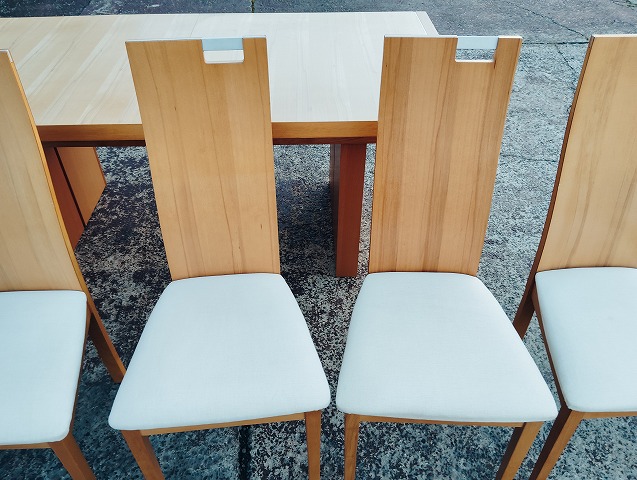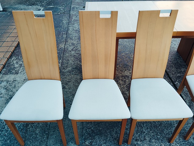 伸張式ダイニングテーブルと椅子7点のダイニングセットです。天板中央部に一部変色箇所があります。イス背もたれに小傷と座面に極薄い染みがあるものがあります。その他目立つ傷や汚れの無い良品です。