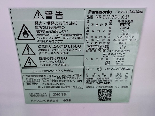 パナソニック NR-BW17DJ-K 2ドア冷蔵庫 黒色 168L『中古良品』2020年