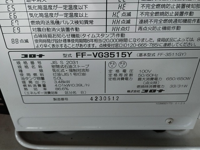 コロナ FF-VG3515Y FF石油ファンヒーター タンク式『中古良品』2015年式
