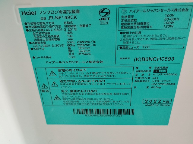 2022年式、148Lの冷蔵庫です。扉にシール跡と側面に小傷がありますが、その他特に目立つ傷や汚れの無い良品です!