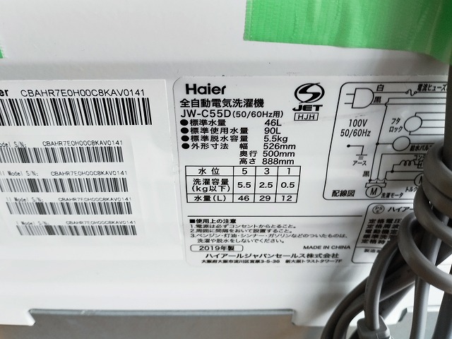 ハイアール 全自動洗濯機 JW-C55D 2019年式『中古良品』