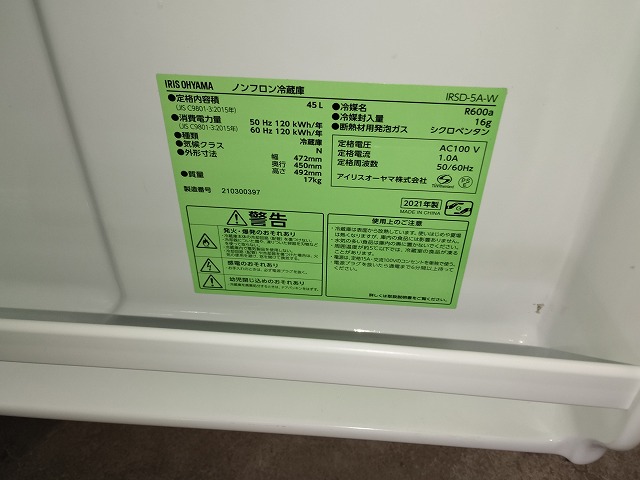 アイリスオーヤマ IRSD-5A-W 1ドア冷蔵庫 白色『美品中古』2021年