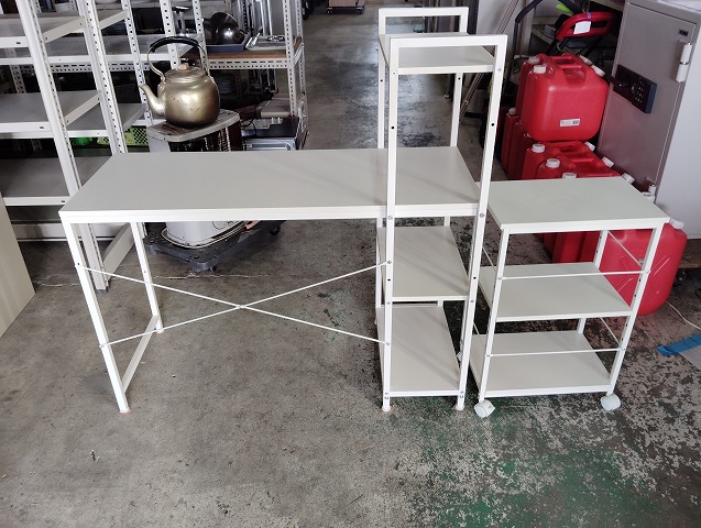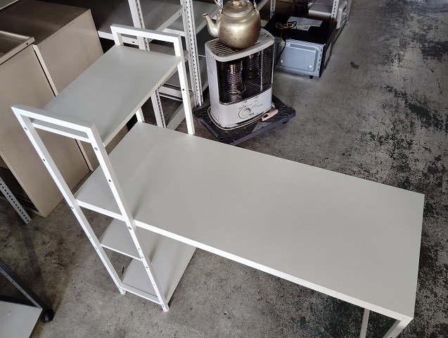 幅1100 高さ715~1150 奥行520 ラック付き平机です。キャスター付きワゴンが付きます。ワゴンの天面に薄い染み汚れがありますが、その他目立つ傷や汚れの無い良品です! ※大型商品につき配達は自社便配達のみ承ります。又、荷受け時にお手伝いが必要です。 ※この商品は新潟県外発送致しません。
