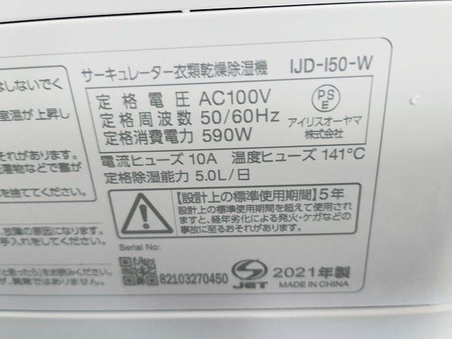 アイリスオーヤマ KIJDC-L50 サーキュレーター付き衣類乾燥除湿器『中古美品』2021年式