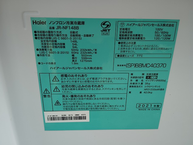 幅502 高さ1275 奥行598 2021年式、148Lの冷蔵庫です。会社事務所で使われていた為使用感薄く、特に目立つ傷や汚れの無い美品です! (ファン式霜取り不要) ※大型商品につき配達は自社便配達のみ承ります。又、荷受け時にお手伝いが必要です。 ※この商品は新潟県外発送致しません。