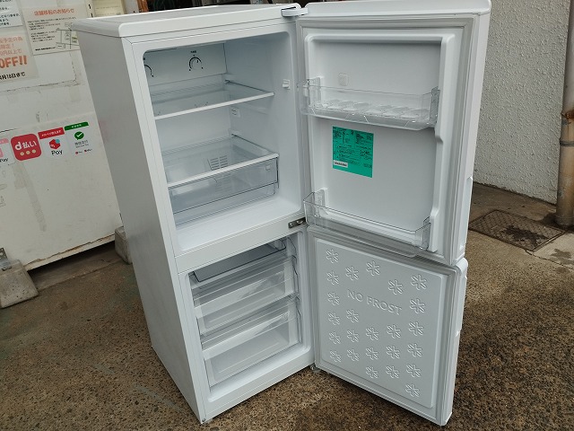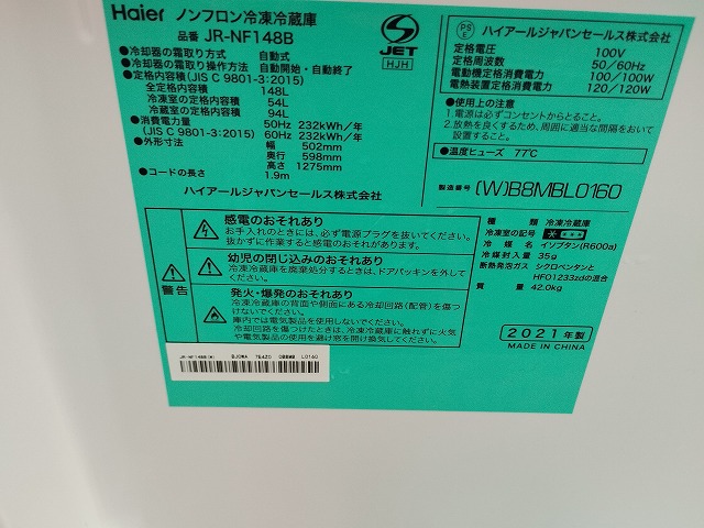 幅502 高さ1275 奥行598 2021年式、148Lの冷蔵庫です。冷蔵室ドアポケット上段にヒビが入っている箇所があります。その他目立つ傷や汚れの無い良品です! (ファン式霜取り不要) ※大型商品につき配達は自社便配達のみ承ります。又、荷受け時にお手伝いが必要です。 ※この商品は新潟県外発送致しません。