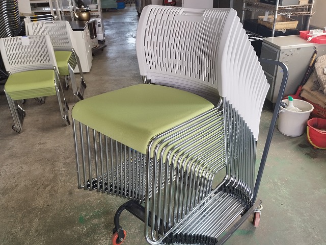 幅440 座面高さ440 背もたれ高さ760 奥行520 同程度で30脚入荷しました!緑布張りのスタックチェアです!目立つ傷や汚れの無い良品です! 新品時一脚約29,000円の品です! (イス用台車は別売りです) ※大型商品につき配達は自社便配達のみ承ります。 ※この商品は新潟県外発送致しません。