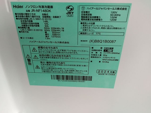 ハイアール JR-NF148DK 2ドア冷蔵庫 黒色 148L『中古美品、使用感無し』2024年