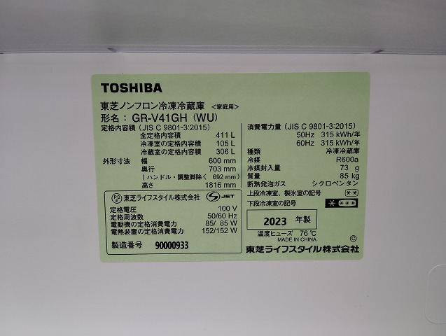 東芝 GR-V41GH(WU) 411L 5ドア冷蔵庫 自動製氷付き(美品)2023年式